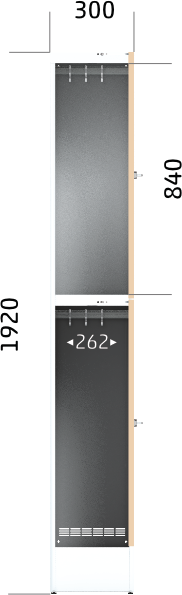 Dělená premium šatní skříňka s naloženými lamino dveřmi, sokl v = 160 mm, šíře oddělení 300 mm, počet oddělení - 1, počet dveří v oddělení - 2, v odd. 270 mm od víka police, na spodní straně police tyč se třemi plast. háčky.