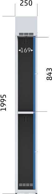 Dělená šatní skříň s lamino dveřmi se šikmým víkem, sokl v = 40 mm, šíře oddělení 250 mm, počet oddělení - 1, počet dveří v oddělení - 2, v odd. na spodní straně víka tyč se třemi plast. háčky. Sešikmené víko s převýšením 195 mm a úhlem sklonu 21°.