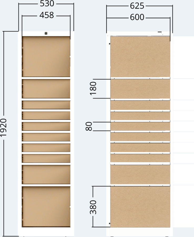 | Přední část skříňové jednotky je zesílená a zjišťuje stabilní základnu pro ukotvení dveří a elektronických zámků. Vnitřní prostor přihrádek je vybaven LED osvětlením. | Dveře mají odolnou dvouplášťovou konstrukci, jsou vybavené omezovačem úhlu otevření. |