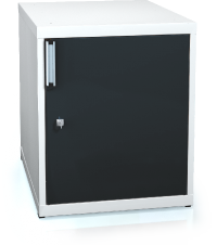 Dveře jsou opatřeny komfortním hliníkovým madlem s drážkou pro vložení popisky. Na vnitřní straně křídla dveří je výztužný prvek s EUROPERFO® otvory pro instalaci držáků nářadí. Uzamykání je řešeno cylindrickými zámky. Dveře jsou po odemčení magneticky přidržovány v uzavřené poloze.