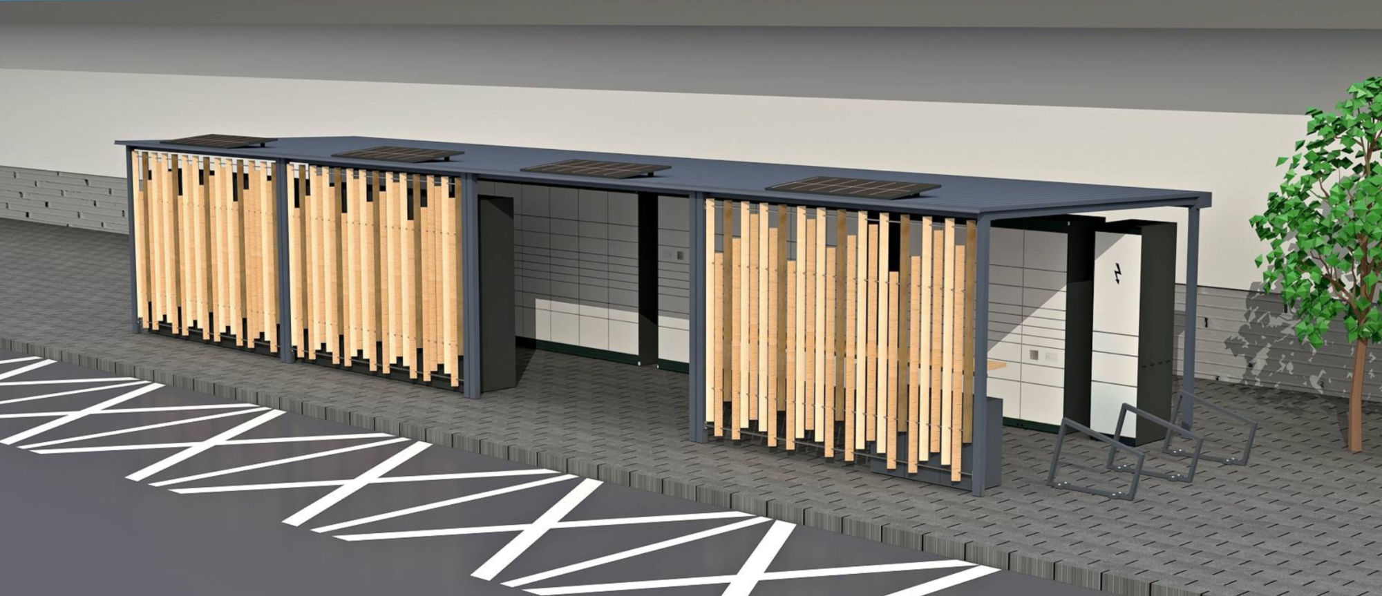 „Jedná se o doručovací hub, ve kterém by byly umístěny doručovací boxy typu Zásilkovna, Alzabox aj. Při navrhování jsem řešila jednoduchost a praktičnost hubu jak vzhledově, tak výrobně, aby nebyl rušivý v exteriéru a byl cenově dostupný. Hlavní roli hraje možnost rozšiřování jedním modulem, který se dá skládat vedle sebe. Konstrukce je montovaná, což usnadňuje převoz i instalaci. Dřevěný dekor dodává návrhu dynamiku a materiálový kontrast, dovnitř prochází přirozené světlo a večer je hub zabezpečen LED osvětlením a kamerou. Využívá také solární panely. Doplňkem je police pro odložení věcí či vybalení zásilky a možnost propojení s koly NextBike.“