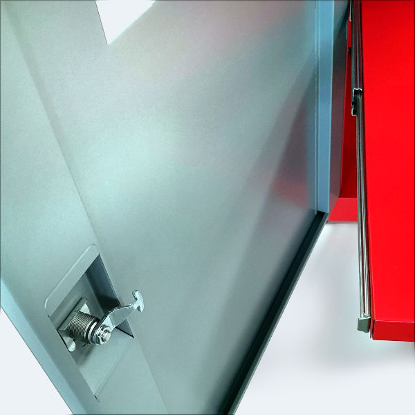 | Dveře ve spodní části skříně mají masivní profilovanou výztuhu a bezpečnostní zesílení v oblasti zámku. Cylindrický zámek je vybaven bezpečnostní hákovou závorou. Výsuvná police na tiskárnu má plošnou nosnost 40 Kg. | Výsuvná police disponuje madlem z eloxovaného hliníku a je vedena teleskopickými výsuvy s nosností 40 Kg. |