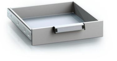 Zásuvky 2427E, teleskopické 100% výsuvy s nosností 40 kg. Korpusy zásuvkových skříní jsou konstruovány jako odolné svařence, mají integrovaný systém centrálního uzamykání a ve dně, příp. zadní stěně jsou vybaveny otvory pro kotvení ke stěně nebo podlaze.