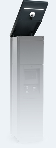 Víko s přesahem se instaluje na skříňové jednotky balíkových doručovacích stanic šíře 530 mm. V čelním přesahu je nainstalované LED osvětlení 5G anténa a IP kamera. Přesah víka účinně chrání uživatele před nepříznivými povětrnostními vlivy.